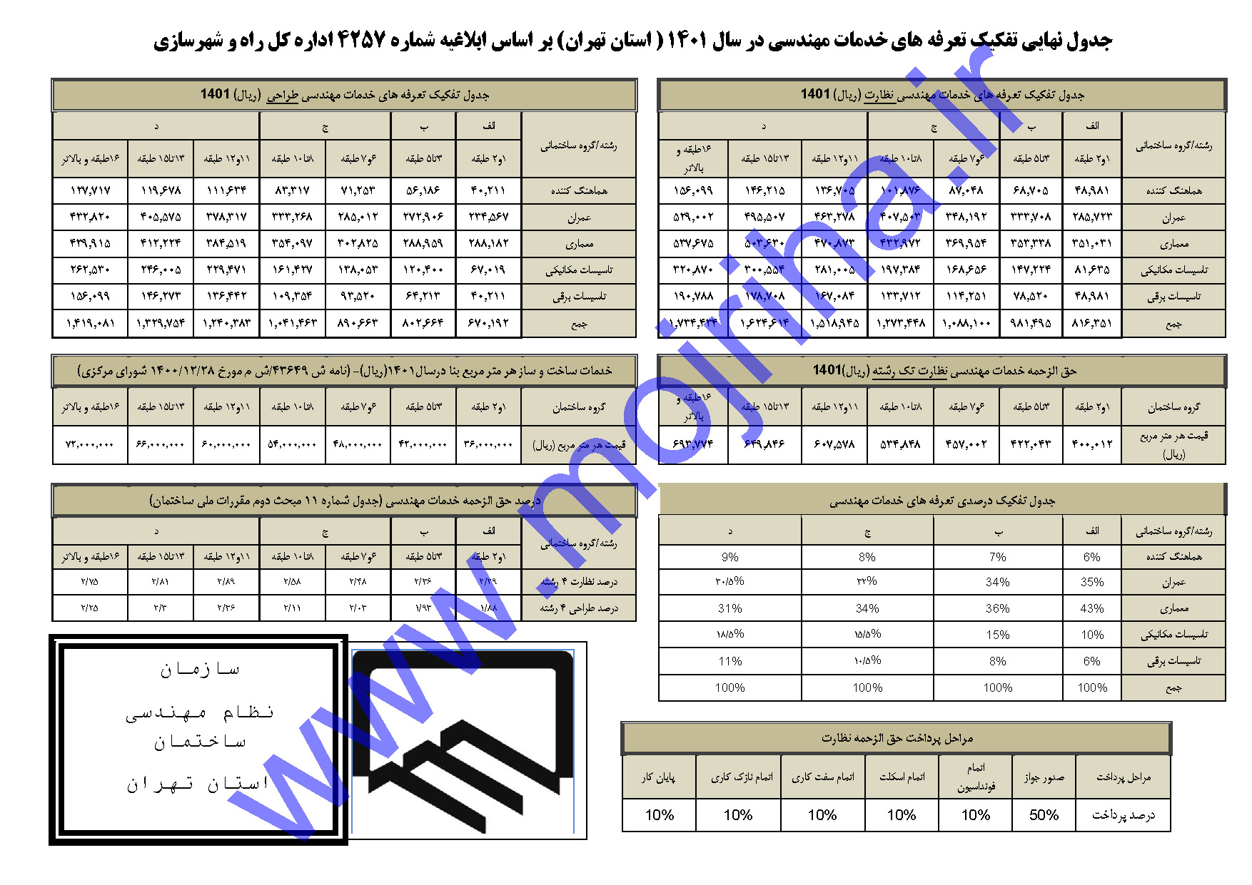جدول تفکیک تعرفه های خدمات مهندسی در سال ۱۴۰۳ استان تهران (نظام مهندسی).