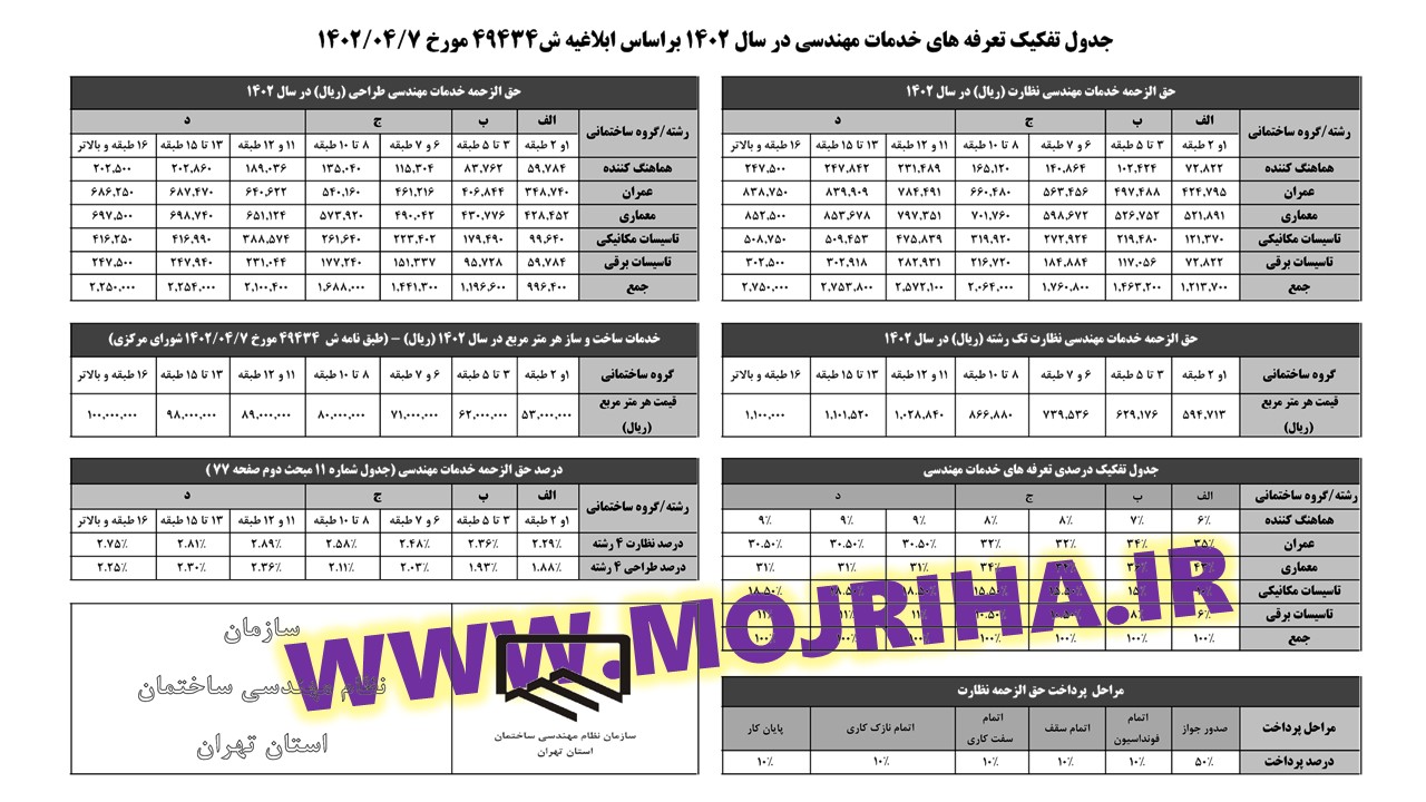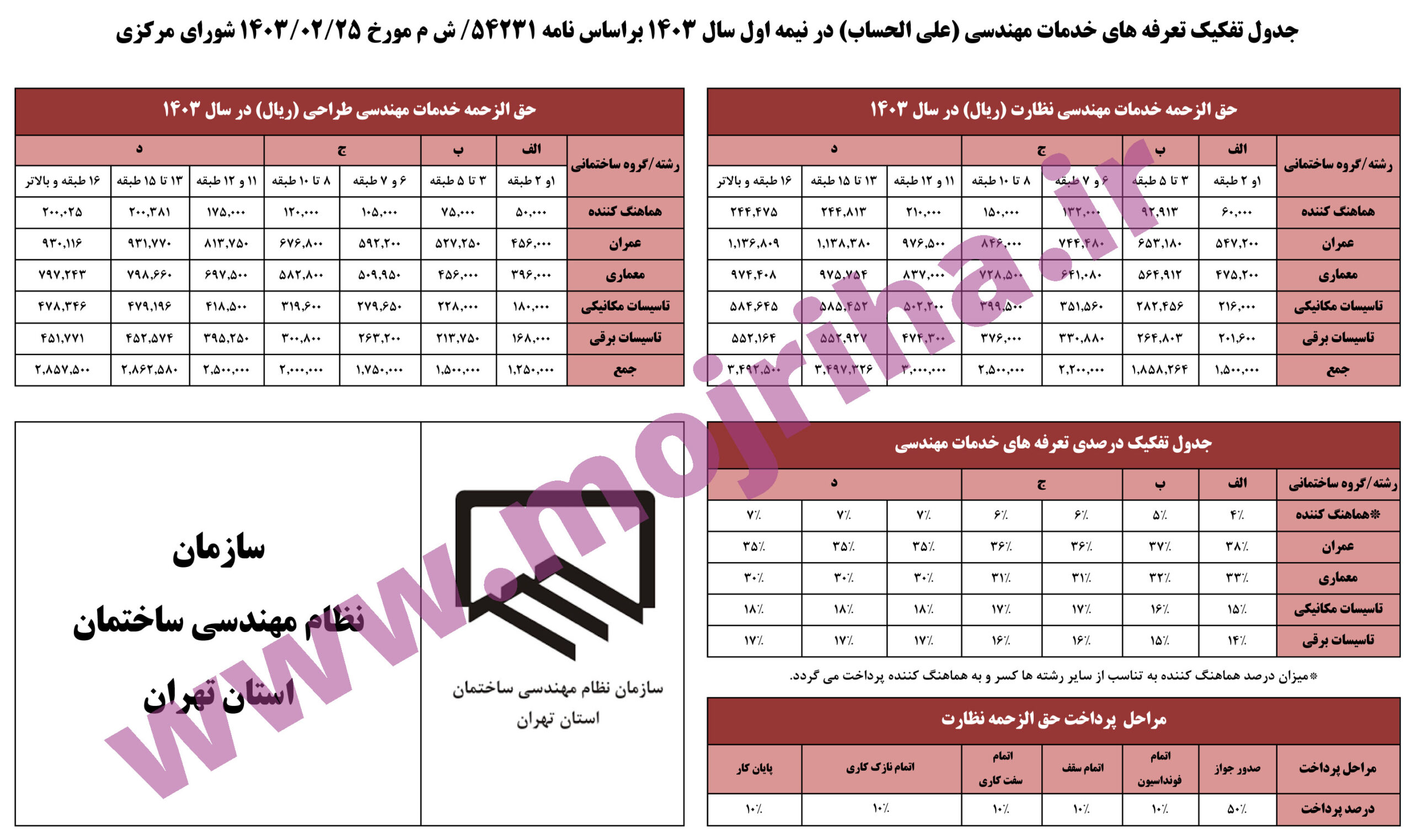 جدول تفکیک تعرفه های خدمات مهندسی در سال ۱۴۰۳ استان تهران (نظام مهندسی).